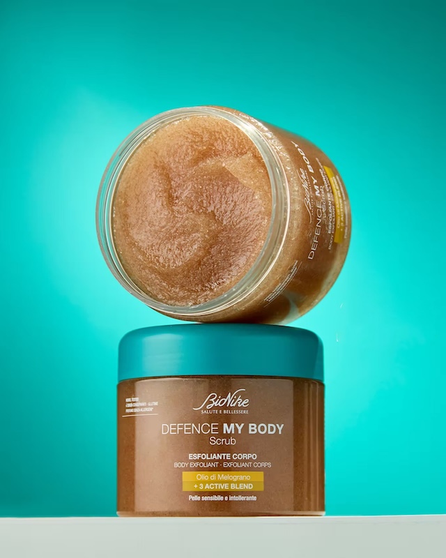 BioNike Body kehakoorija ühendab mehaanilise ja õlipõhise lähenemise. Sahharoos ja looduslikud pulbrid, nagu sarapuupähkli ja mandli koore osakesed, tagavad füüsilise koorimise. Samal ajal pehmendavad magusa mandli õli, seesamiseemneõli ja sheavõi nahka ning vähendavad hõõrdumisega seotud ärritust. Granaatõuna seemneõli lisab antioksüdantse komponendi, mis aitab neutraliseerida keskkonnast tulenevat oksüdatiivset stressi.